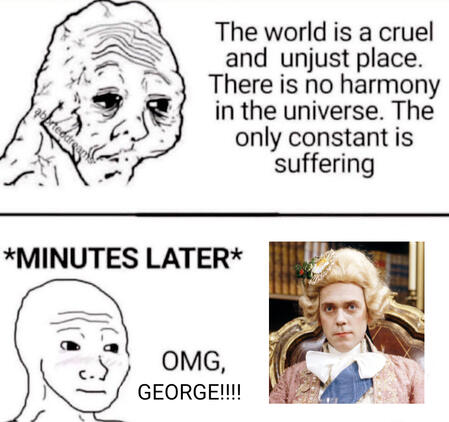 george mean so much to me he is so likeable and every scene he is in manages to make me go AAAAAH (in a good way). his stupidity, the way he has no care in the world but to have fun and/or fashion, muah muah muah i love him. i love his happy-go-lucky attitude and whenever he says something like hurrah bravo huzzah tally-ho or neat-o or something my heart (again) goes AAAAAAAH. he is so precious muah muah muah my beloved comfort character. every time i am cross i take deep breaths and think of george.